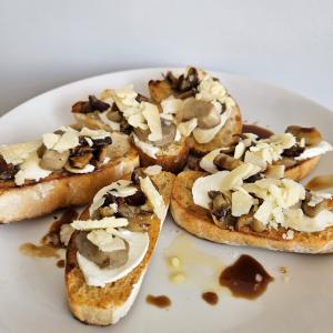 Pão de fermentação natural tostado em azeite de oliva | mozzarella de búfala | shitake salteado no azeite de oliva | tomilho | lascas de grana padano | creme de aceto. (Vegetariano) R$ 49,00