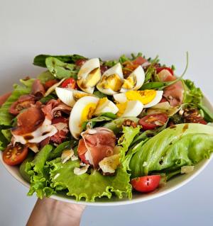 Salmão em laminas | cream cheese | iogurte natural | mini folhas verdes | vinagrete de frutas vermelhas | abacate. R$ 68,00