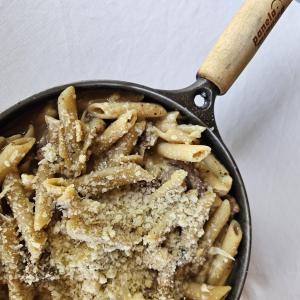 Espaguetinho a bolonhesa com parmesão, acompanha de legumes na manteiga ghee. R$ 24,00