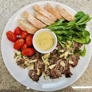 Mignon selado, mal passado e cortado em lâminas | pimenta | rúcula | parmesão | molho caesar | pão ciabatta | azeite de oliva | raspas de limão siciliano. R$ 68,00