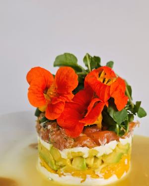 Salmão | cream cheese | manga | abacate | cebola roxa | agrião | emulsão de limão siciliano com mel e azeite. R$ 68,00
