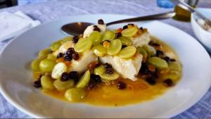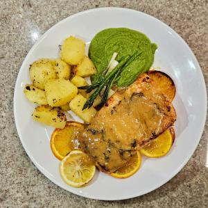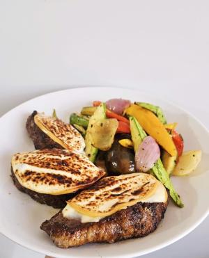 Salmão grelhado, alcaparras e champignon, acompanha espaguete e legumes na manteiga. R$ 36,00