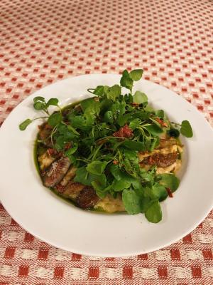 Lâminas de mignon cru | molho caesar | parmesão | raspas de limão siciliano | cheiro verde | rúcula | agrião | azeite de oliva | batata suflê. R$ 68,00