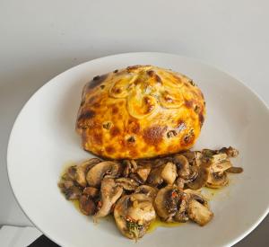 Bolinho cremoso de arroz arbóreo com quinoa | recheado com ragu de cogumelos e queijo vegano | velouté de cogumelos e picles de cebola roxa | brotos verdes. (Vegano) R$ 68,00